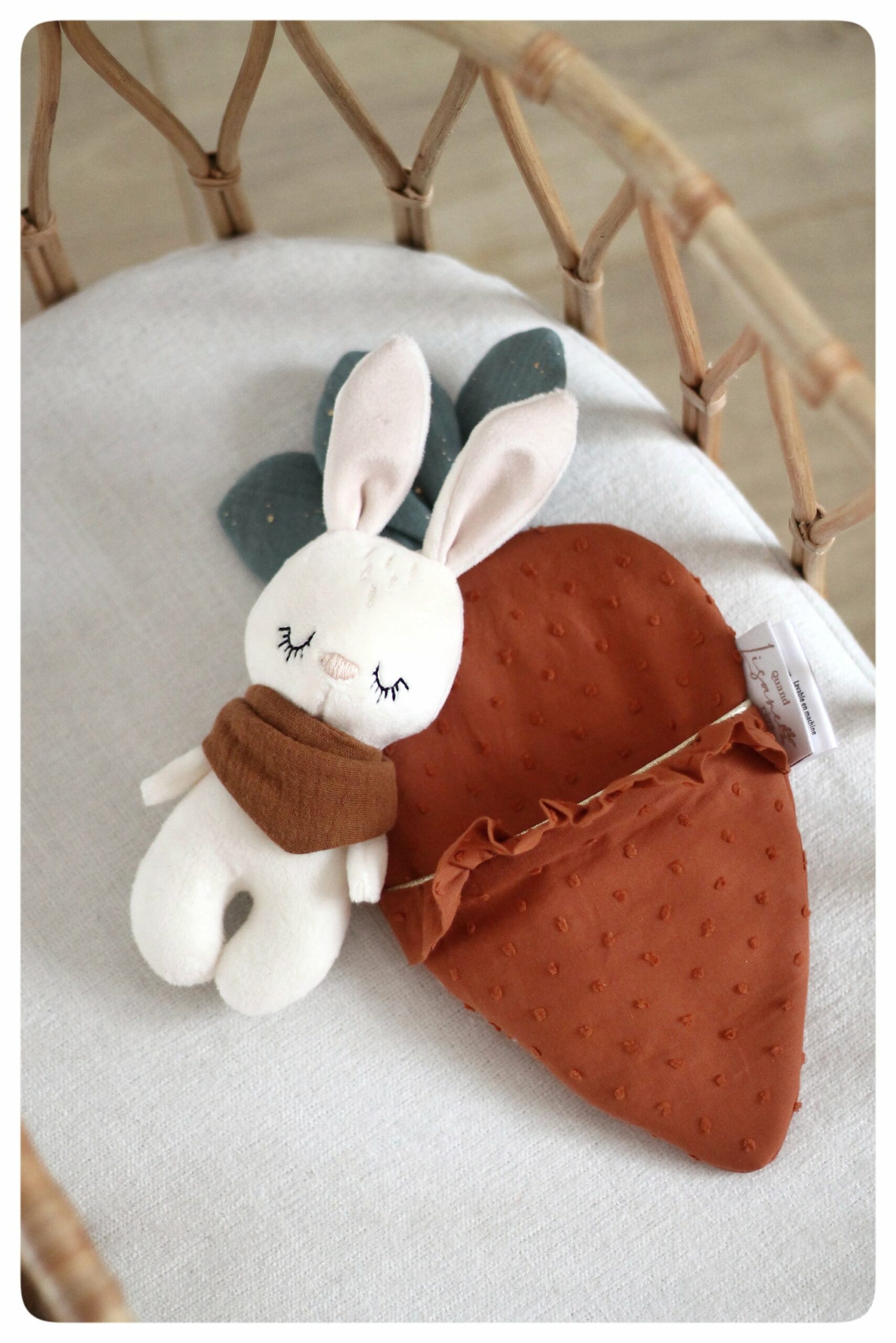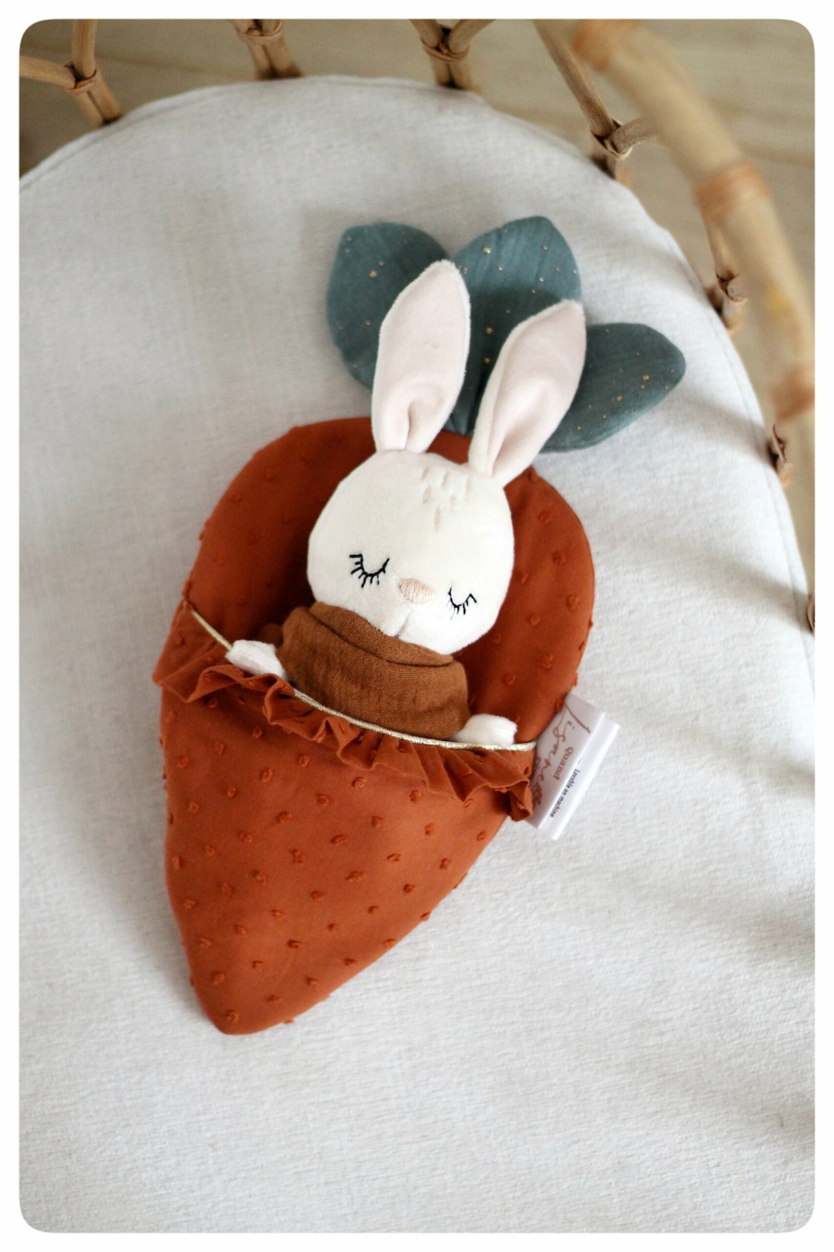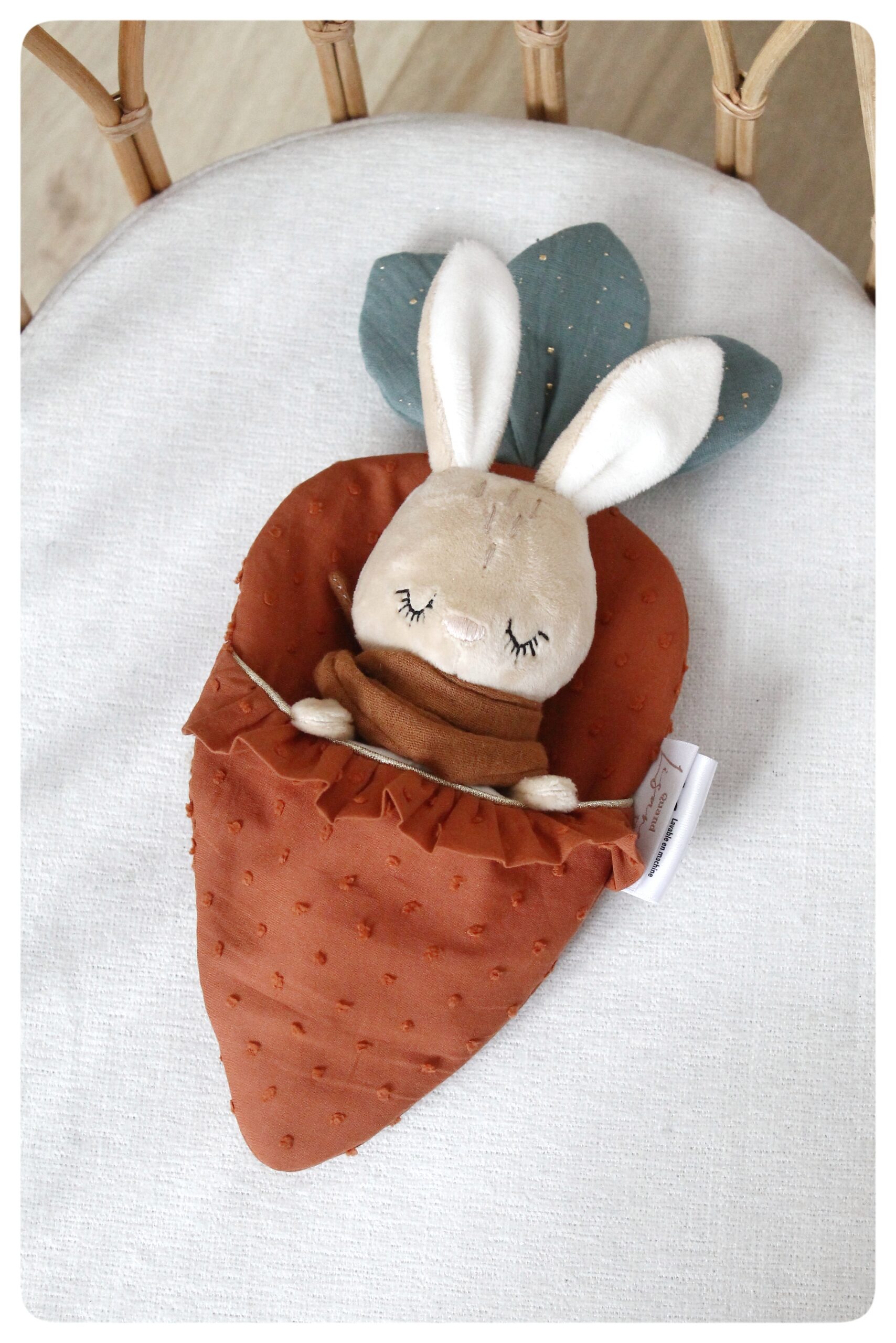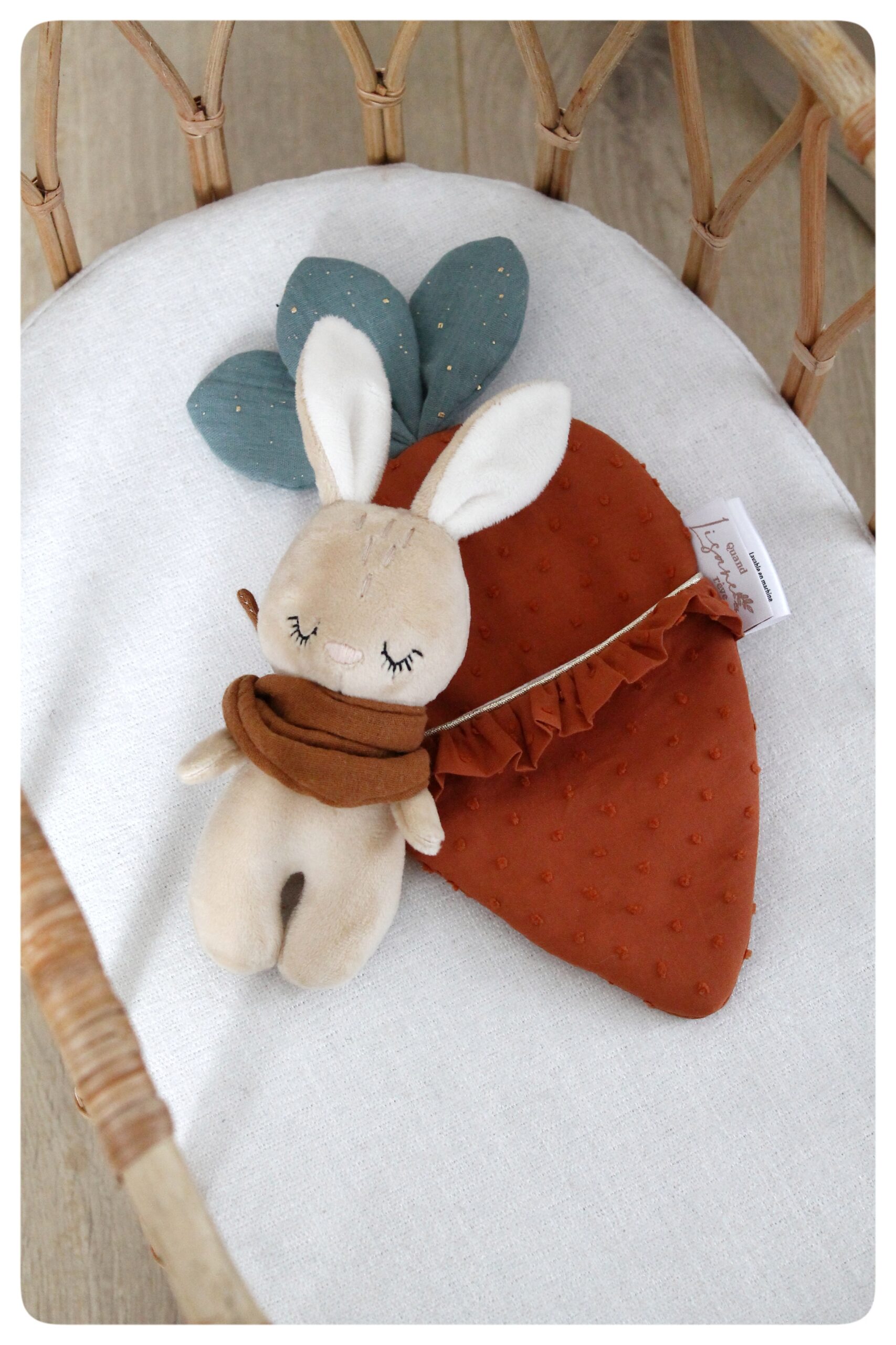 Glissé dans son lit carotte moelleux en plumetis couleur brique, il devient une surprise idéale à cacher lors de la chasse aux œufs de Pâques — un trésor durable que les enfants garderont bien après les chocolats, une alternative parfaite aux cadeaux éphémères !